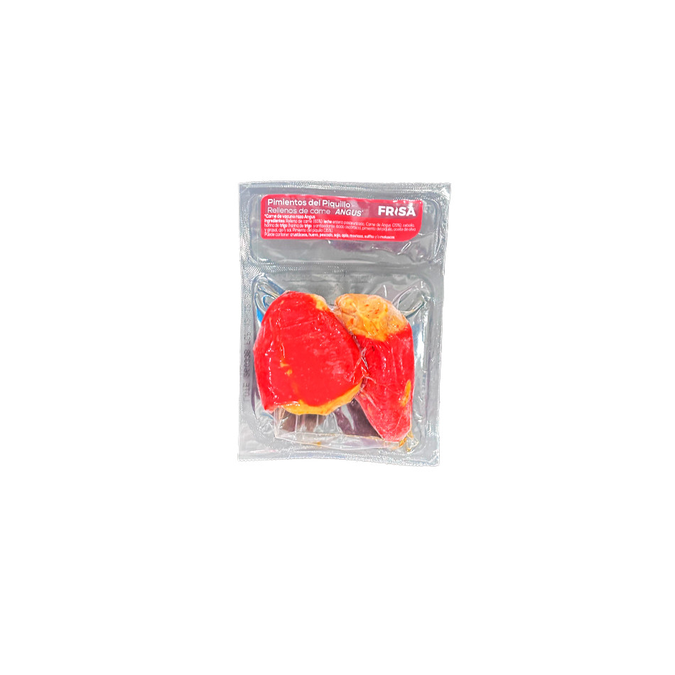 Relleno de carne (65%): leche entera pasteurizada, Carne de Angus (20%), cebolla, harina de trigo (harina de trigo y antioxidante: ácido ascórbico), pimiento del piquillo, aceite de oliva y girasol, ajo y sal. Pimiento del piquillo (35%). ALÉRGENOS: PUEDE CONTENER TRAZAS DE: CRUSTÁCEOS, HUEVO, PESCADO, SOJA, APIO, SULFITOS, MOLUSCOS Y SUS DERIVADOS.