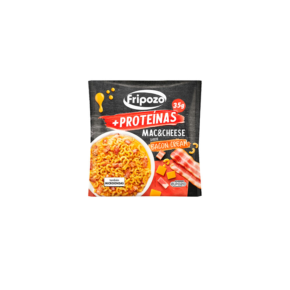 (1%), queso (LECHE) provolone (1%), proteína de la LECHE, suero de LECHE en polvo, sal, pimentón, pimienta negra, cebolla, ajo, dextrosa, aroma], pasta de sémola de TRIGO (gluten) duro cocida (43%) (agua, sémola de TRIGO (gluten), gluten de TRIGO), fiambre de bacon (13%) [carne de cerdo, agua, sal, fécula de patata, azúcar, aroma de humo, estabilizante (E-451), antioxidantes (E-315, E-331)]. ALÉRGENOS: PUEDE CONTENER TRAZAS DE: SOJA Y MOSTAZA.