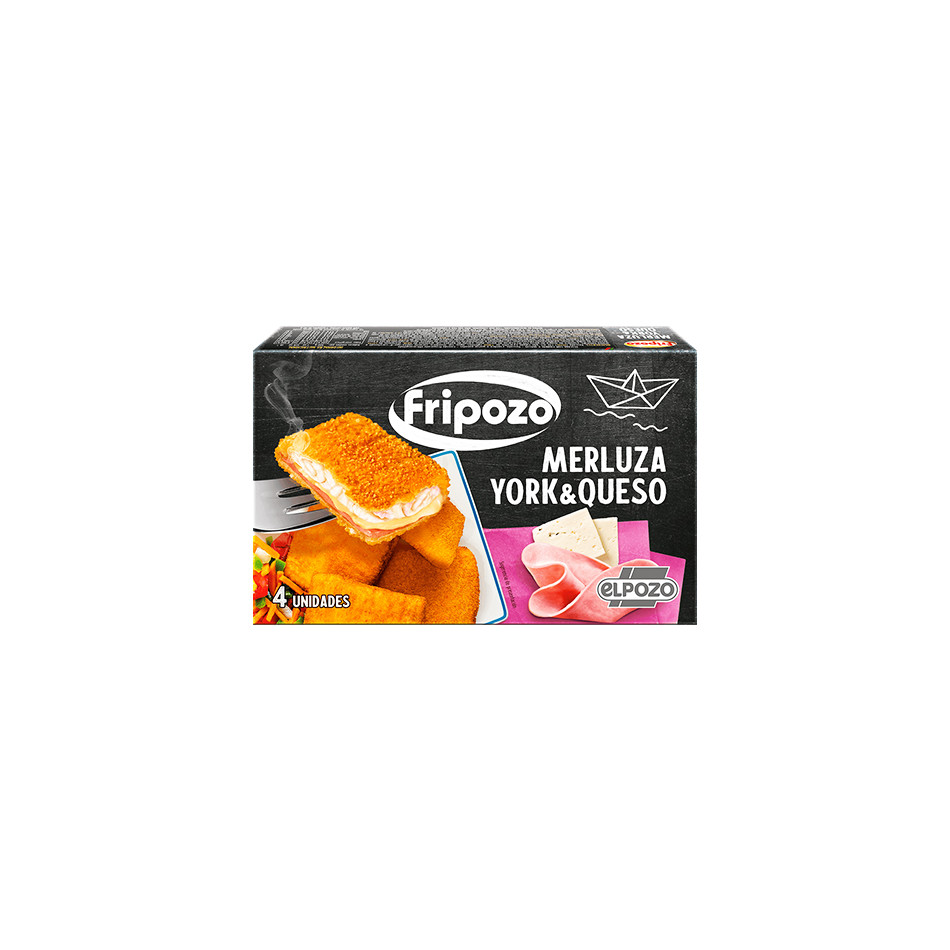 Merluza (PESCADO) (32%), pan rallado [harina de TRIGO (gluten), agua, sal, levadura, colorante (E-160e), aroma natural], fiambre de magro de cerdo (19%) [carne de cerdo, agua, fécula de patata, sal, proteína de SOJA, proteínas de la LECHE, dextrosa de maíz, aromas, estabilizantes (E-450, E-407), antioxidante (E-316)], agua, preparado lácteo a base de queso (8%) [queso (LECHE) (45%), margarina (aceite refinado de palma, aceite refinado de girasol, agua, sal colorante (E-160a)), almidón modificado, proteínas de la LECHE, LECHE desnatada en polvo, lactosuero (LECHE), sales de fundido (E-452, E-331), sal], harina de TRIGO (gluten), almidón, sal, espesante (E-412) ALÉRGENOS: PUEDE CONTENER TRAZAS DE: CRUSTÁCEOS, MOSLUSCOS Y MOSTAZA.
