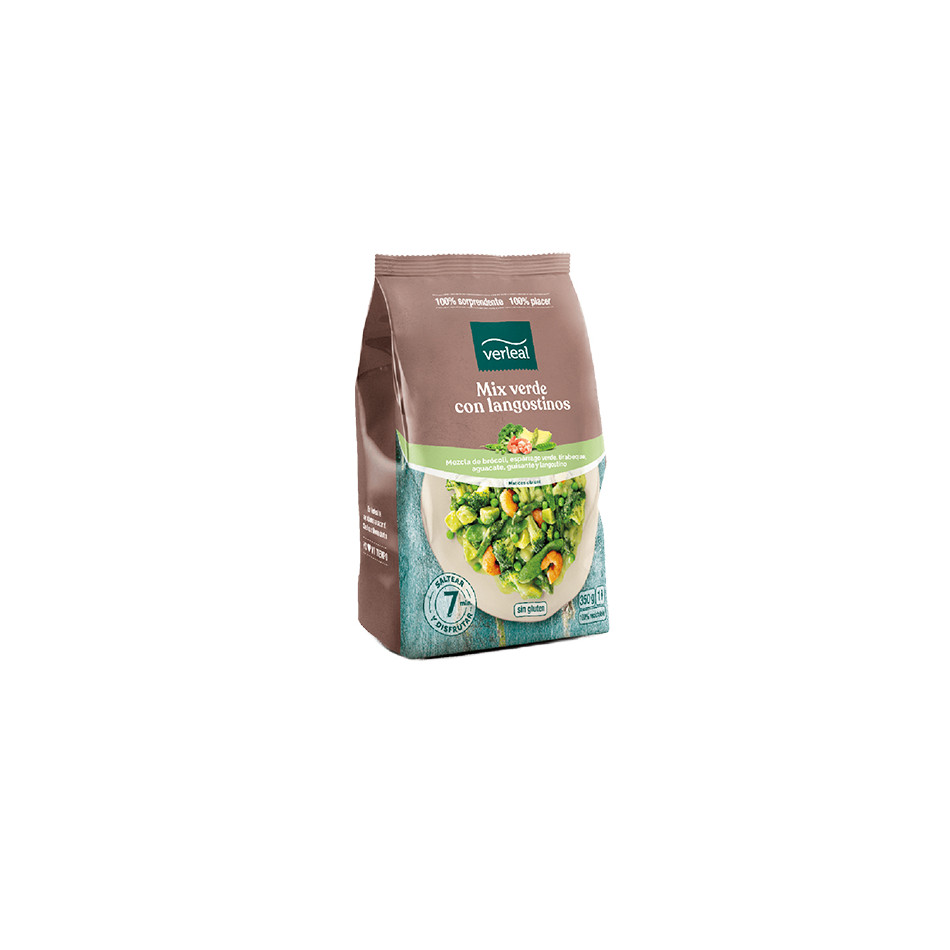 Brócoli, pellet salsa de verduras [agua, 23% verduras (guisante, judía verde), aceite de oliva, ajo (sulfitos), vinagre de manzana, sal, almidón de maíz], langostino crudo (langostino (crustáceo), agua, sal, regulador de acidez (E-331)), peapods (tirabeque), espárrago verde, aguacate (aguacate, sal, antioxidantes (E-330, E-300)), guisante. ALÉRGENOS: CONTIENE: SULFITOS Y CRUSTÁCEOS COMO INGREDIENTES ALÉRGENOS