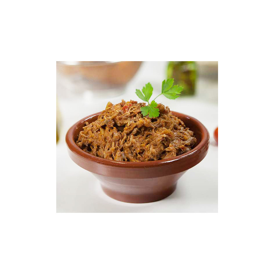 Carne de vacuno (61%), cebolla [cebolla, aceite de oliva virgen, sal], pimiento rojo, zanahoria, aceite de girasol, caldo de carne, sal, ajo, pimentón dulce, pimiento negra, tomillo, orégano, clavo y laurel. ALÉRGENOS: PUEDE CONTENER TRAZAS DE: FRUTOS DE CÁSCARA (ALMENDRAS), GLUTEN, LECHE, PESCADO, SOJA Y SULFITOS.