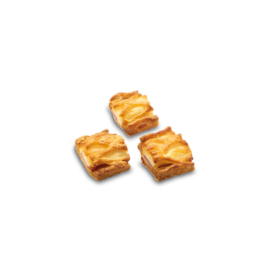 QUESO blanco pasteurizado 31% (MAZADA, LECHE, NATA pasteurizada, almidón, aroma, estabilizante (E461), sal, correctores de acidez (E450, E452), fermentos lácteos), harina de TRIGO, margarina (grasa vegetal (palma), aceites vegetales (girasol, nabina, soja), jarabe de glucosa y fructosa, emulgente (E471), colorante (E160a)), agua, fiambre de paleta cocida 8,7% (carne de cerdo, agua, almidón, sal, proteína de SOJA, proteína de cerdo, estabilizantes (E451, E450, E407), dextrosa, antioxidantes (E301, E331, E316), aromas, conservador (E250)), levadura, clara de HUEVO pasteurizada, HUEVO líquido pasteurizado, almidón, sal, LECHE entera en polvo, HUEVO pasteurizado en polvo, azúcar, gluten de TRIGO, fibra vegetal (TRIGO), agente de tratamiento de la harina (E300). ALÉRGENOS: CONTIENE: TRIGO (GLUTEN), LECHE, SOJA Y HUEVO. PUEDE CONTENER TRAZAS DE FRUTOS DE CÁSCARA Y MOSTAZA.